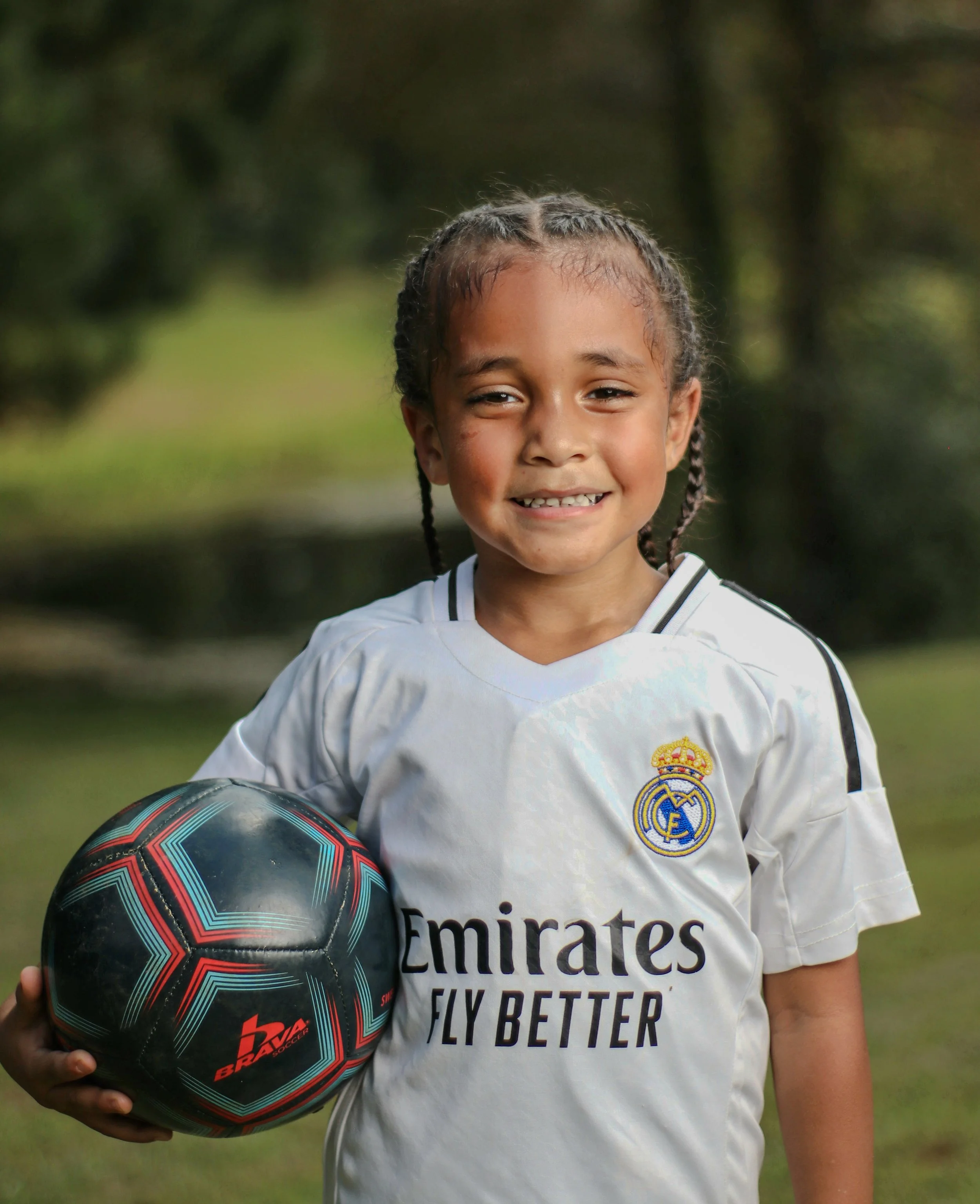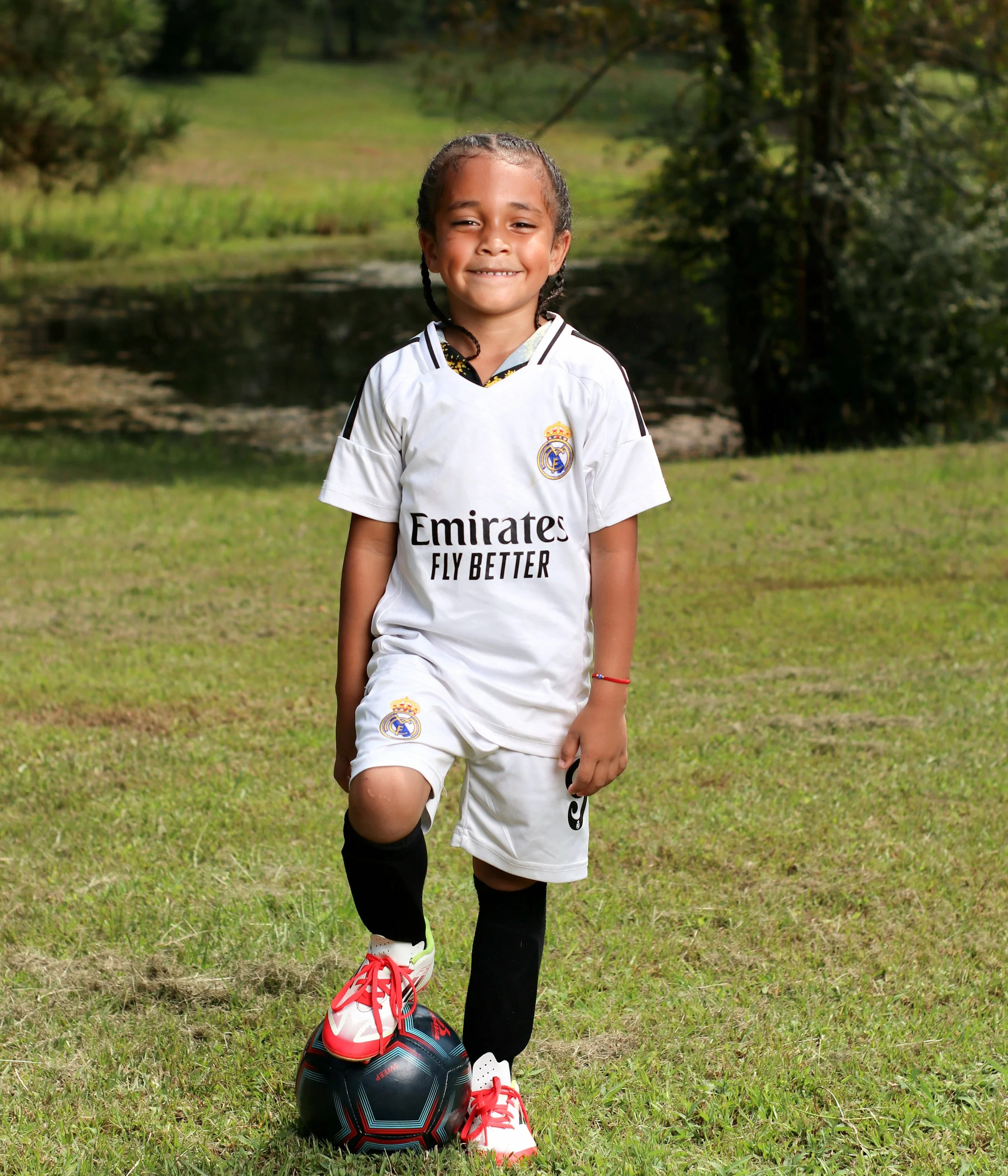 A young girl in a white soccer uniform with the Real Madrid logo, holding a soccer ball, standing outdoors on grass, smiling at the camera.