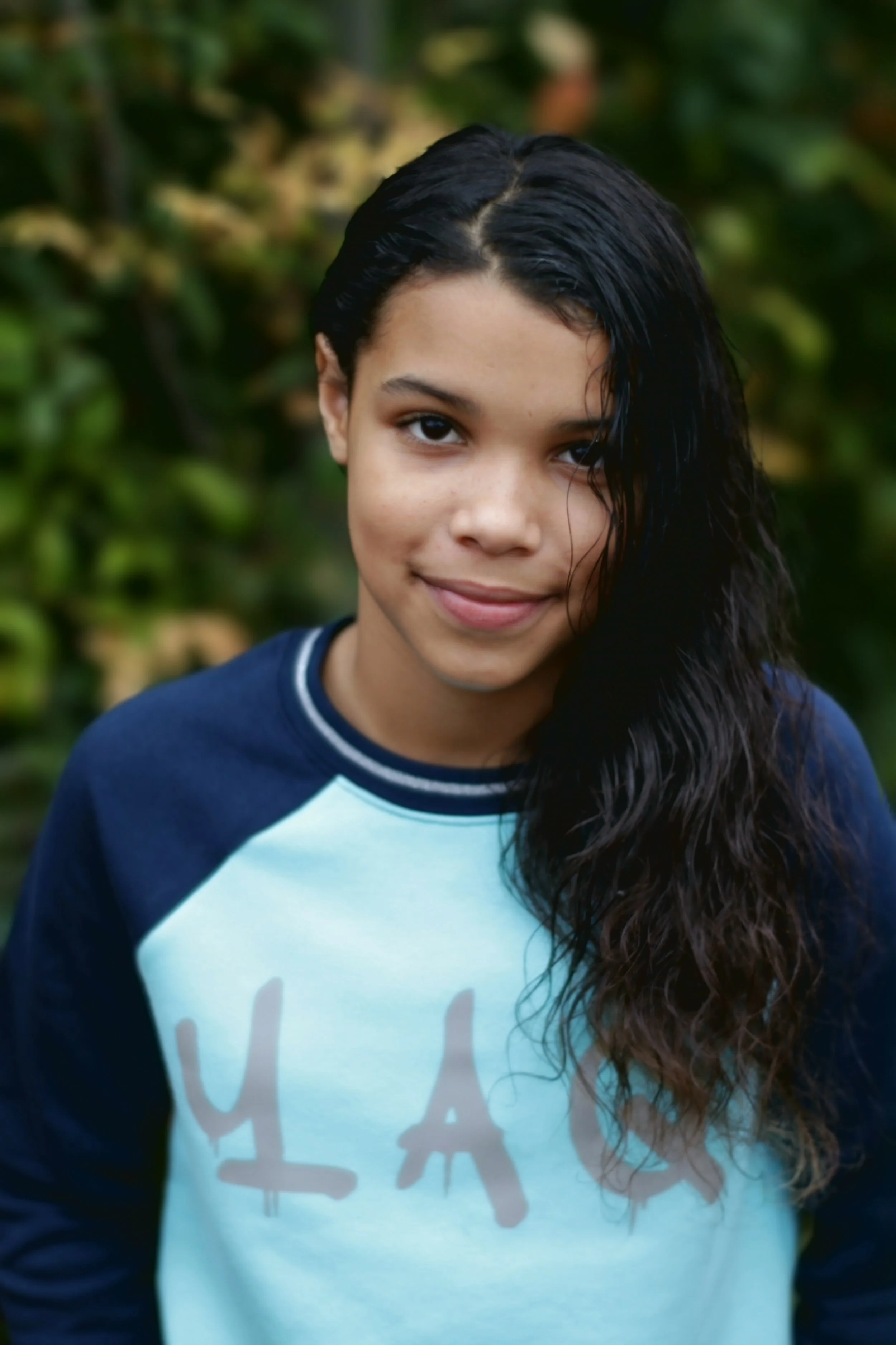 A young girl with long, wavy black hair and a light smile, wearing a blue and light blue sweatshirt with partial text, standing outdoors with blurred green foliage in the background.