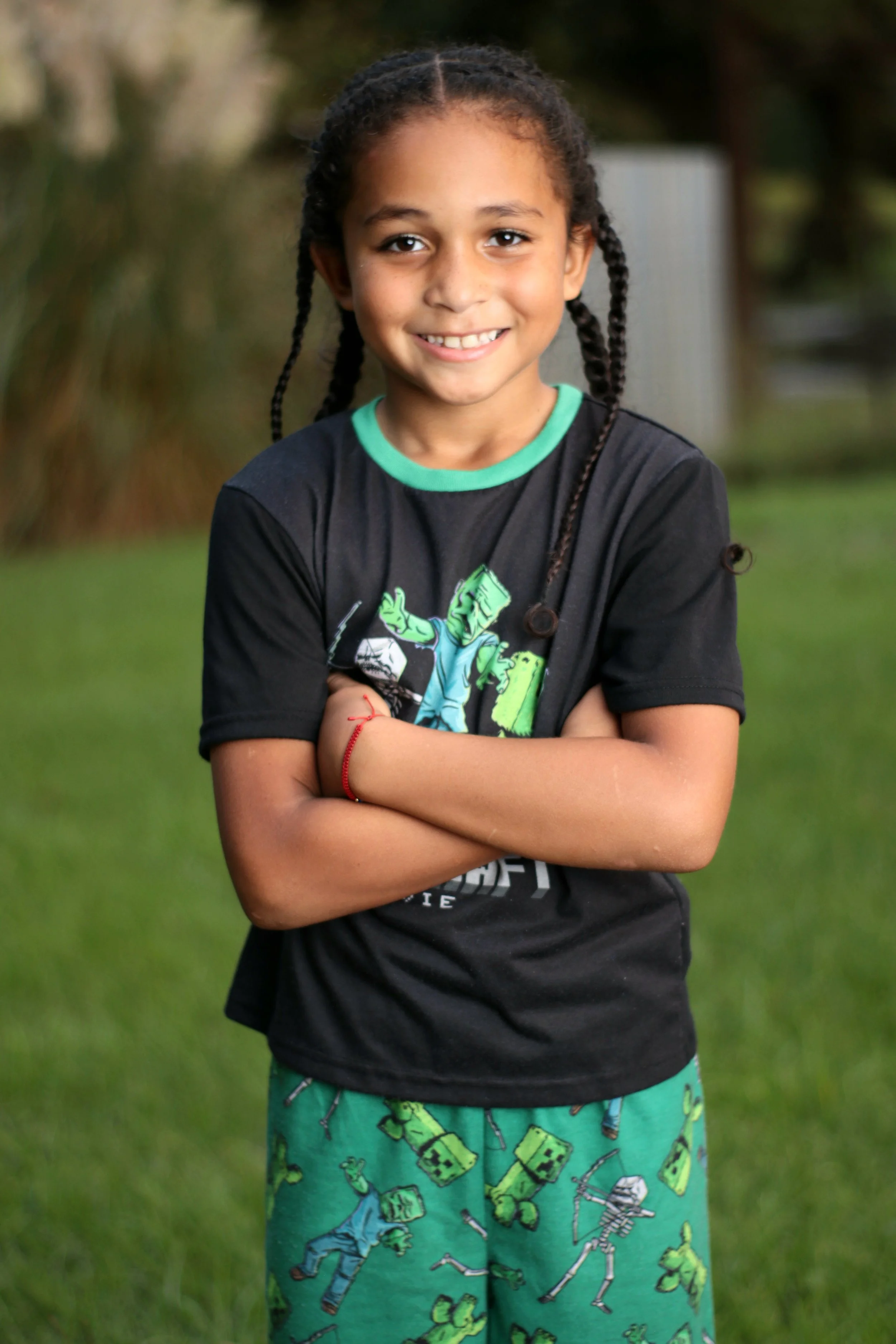 Young girl with braided hair standing outdoors with arms crossed, smiling, wearing a black T-shirt and green pants with pixelated video game character prints.