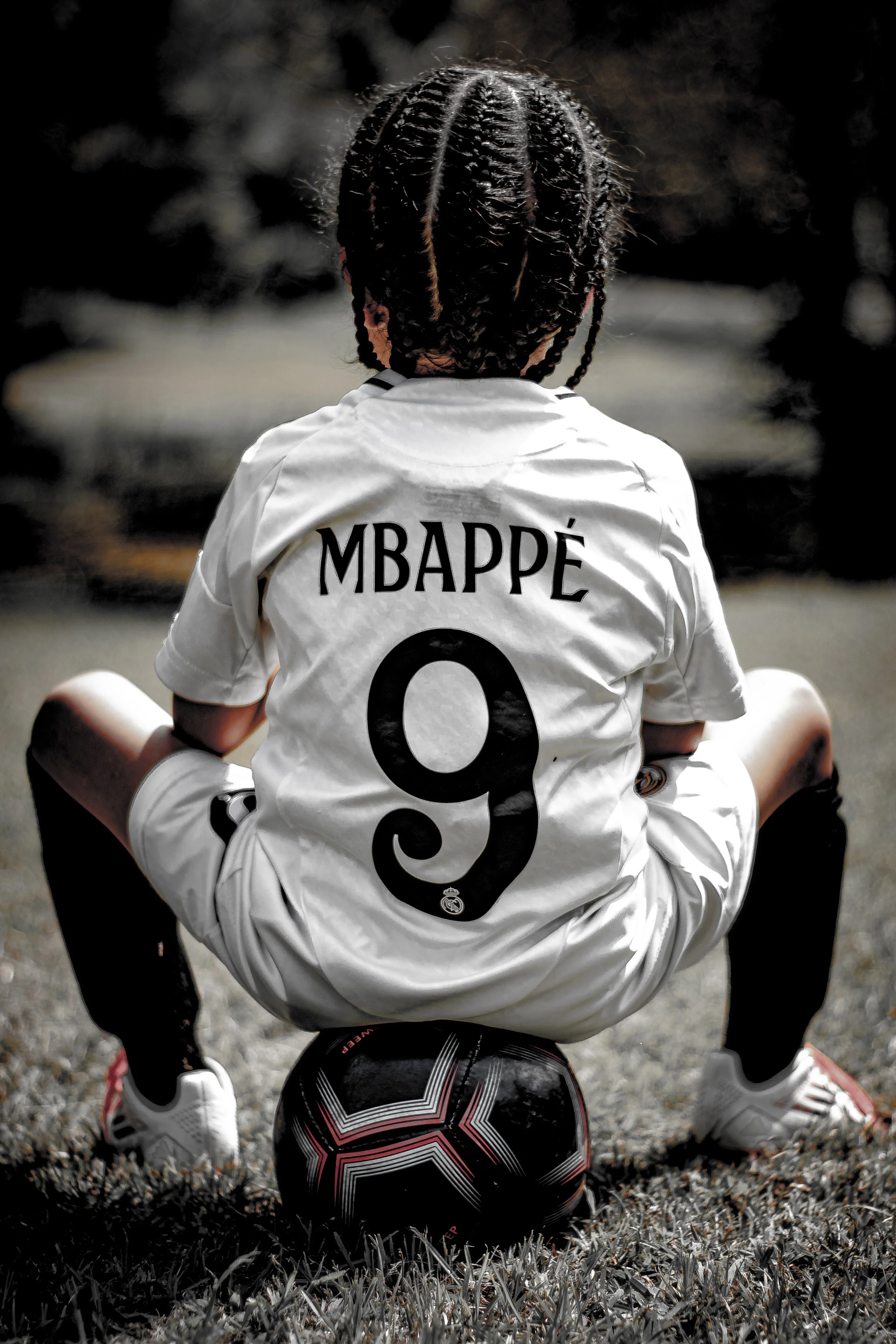 A young soccer player wearing a white jersey with 'MBAPPÉ' and the number 9 on the back, sitting cross-legged on the grass with a black and red soccer ball underneath. The player has braided hair and is facing away.