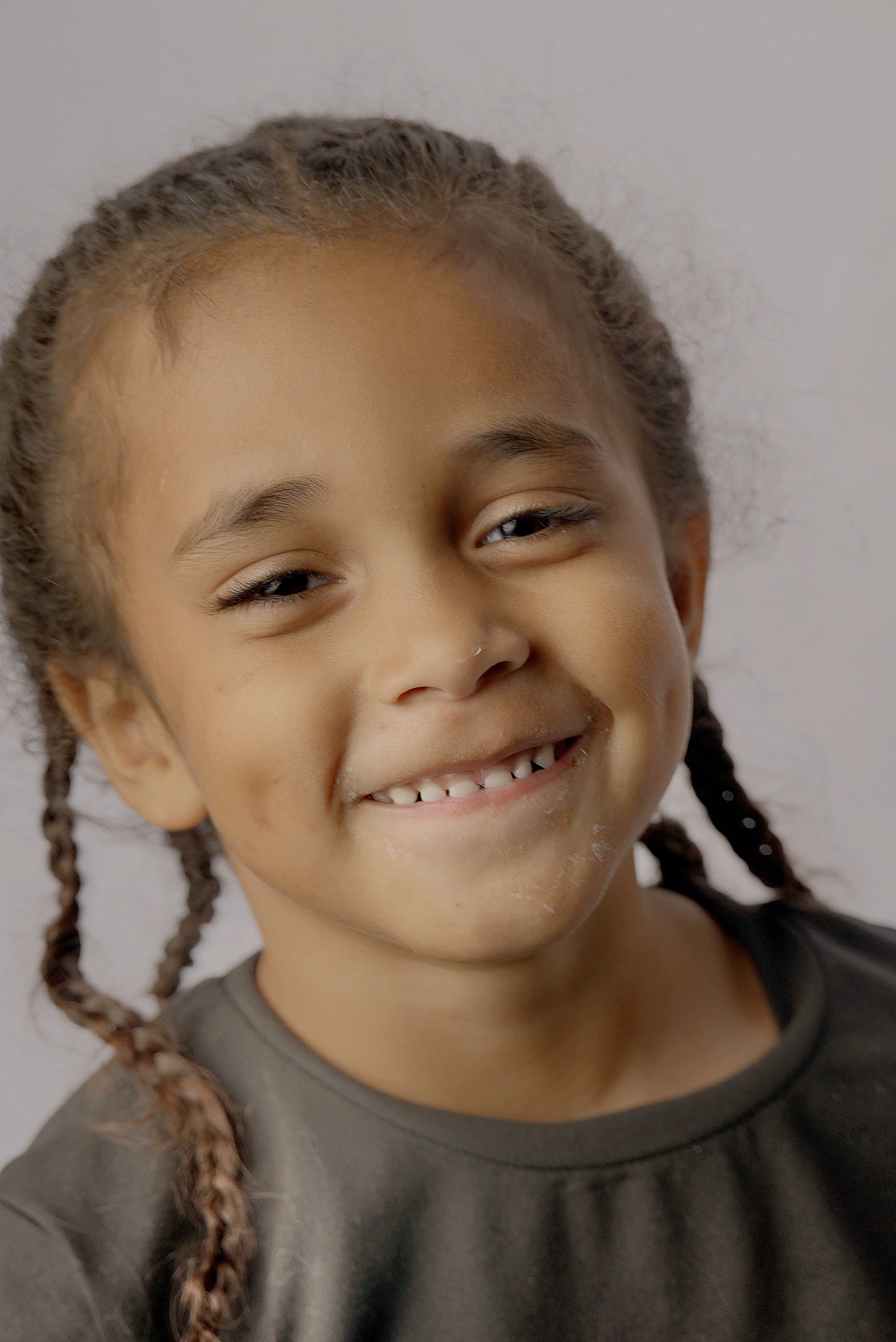 Close-up of a young girl smiling with braces, black hair in braids, wearing a dark shirt, against a neutral background.